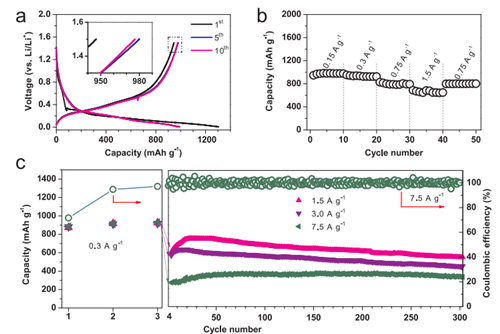 5630福彩网动力锂电池工程实验室自2011年开展硅基负极材料的研究开发,已取得系列进展。2012年报道了一种三维多孔的纳米硅/石墨烯复合负极材料(J. Mater. Chem. 2012, 22, 7724.)最近,又报道了一种新型二维纳米硅/二氧化硅复合负极材料(2D nano-Si/SiO2)。该工作利用层状结构CaSi2的拓扑转变,在酸性溶液中化学剥离Ca原子(如图1a),留下单原子层褶皱状硅烯,由于Si原子只存在sp3杂化,硅烯极不稳定,在水溶液中氧化得到亚稳态二维硅氧烯(如图1b),二维硅氧烯经过合适的热处理条件脱水歧化得到二维纳米硅/二氧化硅复合负极材料(2D nano-Si/SiO2),其中纳米硅均匀分散于无定型硅氧化物(如图1c)。二维结构可有效减少锂离子迁移路程,同时纳米硅和硅氧化物可有效降低了体积膨胀率,因此采用该方法制备的2D nano-Si/SiO2@C表现出优异的循环稳定性和倍率性能。电化学性能测试表明:在0.15A/g条件下,首次放电容量大于950mAh/g,在7.5A/g的大电流密度下,放电容量达360mAh/g,相比于文献已报道的硅或硅氧化物材料,倍率性能具有显著优势(如图2);在1.5,3.0和7.5A/g的大电流密度下,循环300周容量保持率分别为73%,73%和92%(如图3)。该研究工作以“Two-dimensional silicon suboxides nanostructures with Si nanodomains confined in amorphous SiO2 derived from siloxene as high performance anode for Li-ion batteries”为题发表在Nano Energy 2017, 39, 546(http://www.sciencedirect.com/science/article/pii/S2211285517304536)。该新型2D nano-Si/SiO2@C负极材料,有望应用于长续航电动汽车(如图4)。