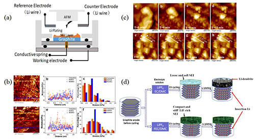 中科院5630福彩网沈彩副研究员在前期利用原位电化学原子力显微镜(EC-AFM)对锂离子电池多种负极材料SEI膜成膜机理进行深入研究的基础上,利用SEI膜成膜电位比金属锂沉积电位更正的特点,设计了两步法研究锂枝晶的实时原位观察实验。研究者可通过利用EC-AFM实时研究以碳酸乙烯酯(EC)和氟代碳酸乙烯酯(FEC)为基础电解液的SEI膜的生长过程,并在此基础上进行原位锂枝晶的生长观察,通过对这两种电解液所形成的SEI膜的杨氏模量、CV图谱及EIS阻抗谱分析,结合XPS光谱分析,研究者发现FEC电解液所形成的SEI膜中含有较多的LiF无机盐,由于LiF具有较好的硬度和稳定性,使得SEI膜具有较高强度,能够有效抑制锂枝晶生长。该研究结果发表在Small Methods上(2017, 1700298,DOI:10.1002/smtd.201700298)。