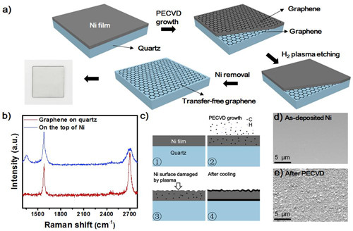 与在金属催化剂上制备并转移的普通工艺方法相比,此方法可在石英片表面与镍金属接触的界面催化原位生长出石墨烯薄膜,该技术有三个优势:(1)生长温度的降低可以减少预先镀在基板上镍膜的团聚现象;(2)镍膜具有金属屏蔽效应,生长在石英和镍膜之间的石墨烯薄膜能避免等离子刻蚀;(3)可以避免在转移过程中带来的杂质污染和褶皱、裂纹等降低石墨烯质量的因素。