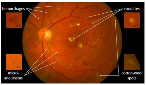 糖尿病视网膜病变、青光眼和白内障合称为人类视力的三大杀手。糖尿病性视网膜病变(DR)是糖尿病的严重并发症之一,目前,国际糖尿病联合会(IDF)发布的糖尿病调查数据显示,2015年中国糖尿病患者已经达到了1.096亿,糖尿病视网膜病变在糖尿病人群中的发病率达1/3。目前对于糖尿病视网膜病变的诊断,主要根据患者的眼底图来确定。一般从患者的眼底图中可以找到微动脉瘤、析出物、出血、棉絮点等病变区域。微动脉瘤是指患者眼部血管扩张,当眼压持续上升时,血管破裂,会引起局部出血。棉絮点,有时又被称为软析出物,是指神经纤维层梗塞或毛细血管前动脉闭塞,硬渗出物则代表了酯质在视网膜和血管外的累积。专业的眼科医生可以根据患者眼底图中病灶点的位置、数量信息确定患者的糖尿病视网膜病变的严重程度。