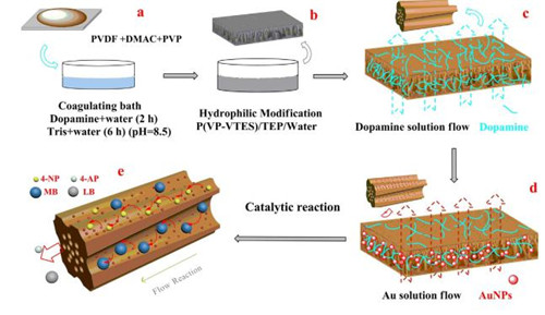 1)PVDF瞬时催化及油水分离膜。针对复杂体系的油水分离问题,以机械性能和热稳定性能优异的聚偏氟乙烯(PVDF)为基膜,制备得到具有微纳米多级组装结构的PVDF-AuNPs微反应器分离膜。首先利用聚多巴胺作为膜表面“功能涂层”,对PVDF基膜进行初步修饰,然后将AuNPs微球通过动态过滤的方法负载到PVDF的指状孔内,形成微反应器。所得膜能够对含有硝基苯酚的水包油复杂体系,实现瞬时的硝基苯酚催化降解和油水分离。该方法对于将油水分离膜应用于实际含油废水处理,起到了重要的推动作用。相关工作已经发表于Chemical Engineering Journal, 2018, 334,579,王建强副研究员和吴紫阳为共同第一作者,刘富研究员为通讯作者。