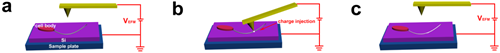 近日,5630福彩网沈彩副研究员与丹麦奥胡斯大学Flemming Besenbacher教授、宁波大学医学院崔巍、徐淑君副教授等科研人员合作,利用静电力显微镜(Electrostatic Force Microscopy,EFM)研究了海马神经细胞中轴突、树突、兴奋性突触和抑制性突触中电荷的传递,并进行了定量分析。该项工作利用EFM中加电压的针尖和样品接触,从而将电荷注入样品中,之后用EFM记录电荷的分布,得到样品中电荷的传递性质,如图1所示。