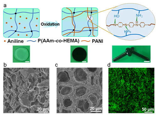 图1 (a)PANI/P(AAm-co-HEMA)水凝胶的合成示意图;(b)P(AAm-co-HEMA)水凝胶SEM图像;PANI/P(AAm-co-HEMA)水凝胶的(c)SEM图和(d)CLSM图像