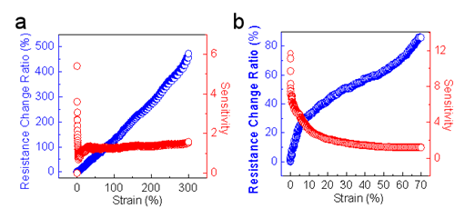 该成果以“Ultra Stretchable Strain Sensors and Arrays with High Sensitivity and Linearity Based on Super Tough Conductive Hydrogels”为题发表在Chemistry of Materials上(2018, DOI: 10.1021/acs.chemmater.8b03999,链接:https://pubs.acs.org/doi/10.1021/acs.chemmater.8b03999),付俊研究员为通讯作者。相关技术已经申请了中国发明专利(CN 201710073869.2)。