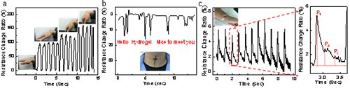 图3 PANI/P(AAm-co-HEMA)凝胶应变传感器用于检测手腕弯曲(a)、声带震动(b)以及脉搏(c)
