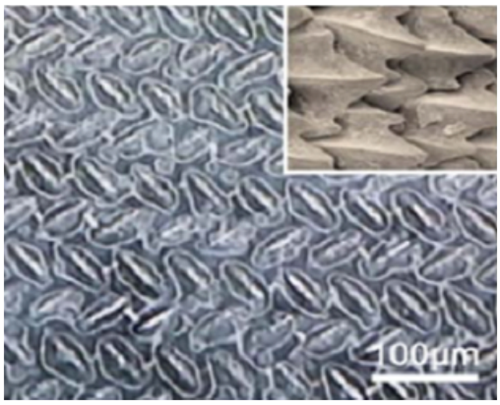 海洋生物如鲨鱼、海豚等可以在极低阻力下快速游动,且身体不被其他海洋生物、微生物所附着,其身体机能与自身结构将减阻与防污性能发挥得淋漓尽致。海洋生物的游行阻力低主要由于以下几方面因素:身体具有流线型且表皮具有织构化结构;其自身分泌粘液驱赶附着生物,同时降低运动过程中水的剪切力。