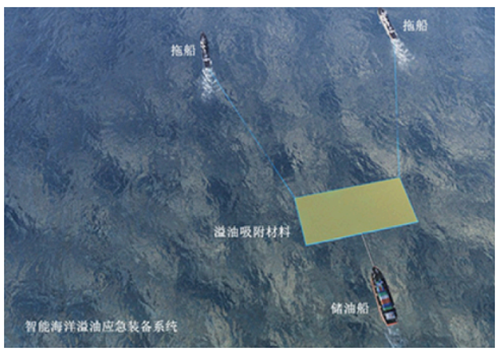 基于研制的吸油网和吸油多孔材料,海洋环境材料团队正在联合上海北斗产业园区相关企业开发5万平方米的智能海洋溢油应急装备系统。该智能溢油应急系统能够利用北斗导航系统和无人机,通过溢油海域图像处理系统检测溢油事件。当发现溢油时,系统会选择相应溢油回收装置,并自动指挥无人船及溢油回收装置前往溢油事故地点,进行海域溢油事故的处理。由于亲油疏水材料的超疏水特性,其在水面中拖行时具有极低的阻力,因此该系统采用两艘无人船将吸附材料高速拖行至溢油事故地点。吸附材料内置仿生吸油管道、网状结构体、管道泵、两级提纯系统、在线油含量检测系统。材料吸附油渍后,通过管道泵,逐级进入提纯储油囊,利用储油囊中的超疏油-超亲水材料,对油进行逐级分离与提纯,最后运至储油船,吸附材料外层采用网状柔性纤维结构,防止波浪打散或损坏材料,在线监测装置对吸油后的海水进行在线检查,检查海域水质是否达标,如果海域水质不达标,系统将再次进行清理。该研究成果有望在溢油事件发生时实现溢油的快速、高效处理与回收。