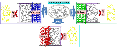 首先,针对磁控溅射GLC涂层与钢材基体间结合力差的问题,团队基于前期研究建立的金属元素与碳的不同成键特征(J. Phys. Chem. C, 119 (2015) 6086,Thin Solid Films,607 (2016) 67),选择Cr、Ti、W作为三种强膜基结合的金属过渡层,对比研究了其对GLC涂层界面结构的催化行为和影响规律(ACS Appl. Mater. Interface 9 (2017) 41115)。发现,Cr、Ti、W过渡层均可导致界面处碳卷曲结构形成,诱导石墨化;但增加温度,sp2结构反向溶解和Ti-C键强稳定性导致石墨化含量降低,而Cr、W过渡层则呈现高温增加石墨化的催化功能。这不仅解释了Cr/GLC涂层中获得的导电耐腐蚀实验现象(发明专利,201611030648.9,201410727479.9,Surf. Coat. Technol. 307(2016) 374),也提供了一种金属催化非晶碳转变特殊结构碳材料的制备新思路。