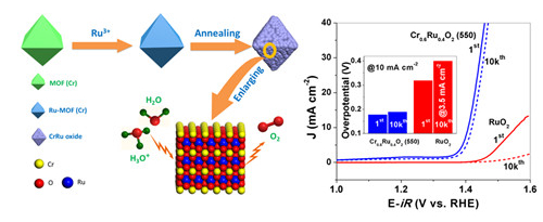 最近,林贻超博士基于Cr基金属有机框架材料,通过吸附RuCl3前驱体、退火等手段成功制备出了新型CrO2-RuO2固溶体材料。通过PXRD晶修、Vegard’law 验证等技术确定了CrO2-RuO2固溶体的结构,并通过原子分辨球差电镜直接观察到Cr、Ru原子均匀分布于同一个纳米单晶中。该材料在10mA cm-2电流密度下,其过电位仅为178mV,并且经过10000次循环后,过电位仅升高了11mV,远优于商业RuO2。通过同步辐射近边吸收测试发现Ru原子在晶体结构中由于4价Cr的强吸电子作用,价态略高于+4价,并且Ru-O的键长变短。田子奇博士通过密度泛函模拟计算发现,正是由于晶格中+4价Cr的吸电子作用导致Ru的催化活性变高,降低了反应能垒。此外,值得注意的是,该固溶体材料中贵金属Ru的含量仅占40%,可显著降低催化剂的成本。该工作近日以“Chromium-ruthenium oxide solid solution electrocatalyst for highly efficient oxygen evolution reaction in acidic media”为题发表在Nature Communications (DOI: 10.1038/s41467-018-08144-3)上。林贻超与田子奇为论文共同第一作者,陈亮为论文通讯作者。