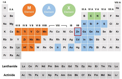 图1 MAX相三元元素组成示意图。M为前过渡金属(橙黄色元素),A通常为主族元素(天青色元素),X为碳或氮元素(草绿色元素)。