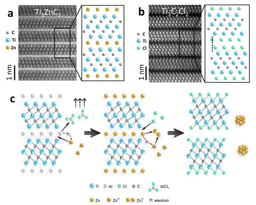 图2 a.Ti3ZnC2的原子结构图片;b.Ti3C2Cl2的原子结构图片;c.Ti3AlC2与ZnCl2反应生成Ti3ZnC2和Ti3C2Cl2的机理示意图