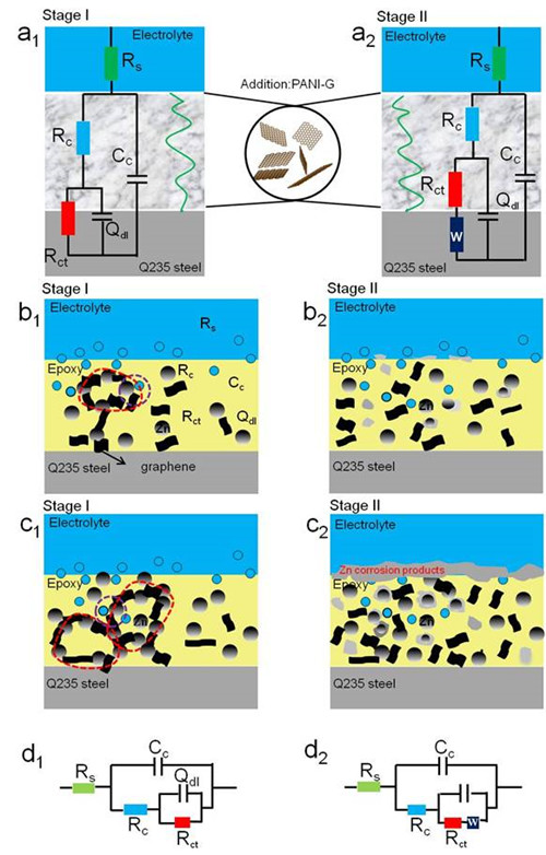 我国在石墨烯涂料领域研究起步较早,目前无论在基础研究还是工程应用领域都已取得一些重要成果。当前石墨烯在涂料中最为熟知的防腐机制为物理屏蔽效应和锌激活机制,研究工作主要关注石墨烯添加量变化与涂层防腐性能之间的“构-效”关系。然而,涂层的腐蚀防护与失效是一个长期的、动态的、复杂的过程,石墨烯的本征结构、分布状态和服役阶段等因素均对其防腐机制有重要的影响,需要进一步深入细致的进行研究。