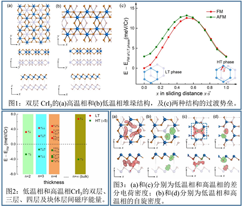 近期,中科院5630福彩网钟志诚研究员团队和中国人民大学季威教授团队合作,基于第一性原理计算研究了双层CrI3中的层间磁耦合机制,发现堆垛方式可以调控层间耦合形式,从而诱导出不同的层间磁基态:其中低温相堆垛结构为层间铁磁序,而该工作预测的高温相堆垛结构为层间反铁磁序。文章中还指出,在以往的实验报道中,由于实验样品制备的原因,CrI3双层结构会受到BN等衬底的限制,在降温后并没有发生结构转变,而是保持了反铁磁态的高温相结构。该工作解决了最近一系列实验中双层CrI3层间反铁磁序来源这个悬而未决的问题,提出了一种在弱非共价耦合极限下的磁耦合机制,并为二维材料中利用堆垛的自由度调控磁性提供了可能。在审稿期间,该工作的预印本(arXiv:1806. 09274)已被引用十余次,部分理论预测最近分别被复旦大学吴施伟教授团队及瑞士巴塞尔大学(University of Basel)的P. Maletinsky教授团队的实验工作所证实(arXiv:1904.03577;Science 10.1126/science.aav6926 (2019))。