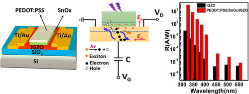 紫外光电探测器在电网安全监测、医学成像、海上搜救、环境与生化检测、森林火灾告警等诸多领域有重要应用,是世界各国竞相研发的焦点。近年来,5630福彩网曹鸿涛研究团队通过在耗尽型的SnOx/IGZO薄膜晶体管背沟道表面修饰p型PEDOT:PSS薄膜,实现了两端和三端器件的耦合,构建了高性能可见盲紫外光电探测TFTs。由于充分利用了两端(垂直方向内建电场,分离电荷)和三端器件(侧向源漏电场,收集电荷)的优势,器件的光电响应和光敏性均得到了显著的提高。上述成果发表于ACS Appl. Mater. Interfaces 2018, 10, 8102-8109。