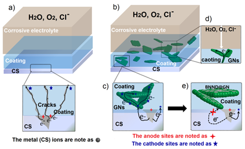 图2 不同涂层体系的腐蚀机理:(a)纯环氧涂层,(b-e)改性前后的石墨烯/环氧涂层