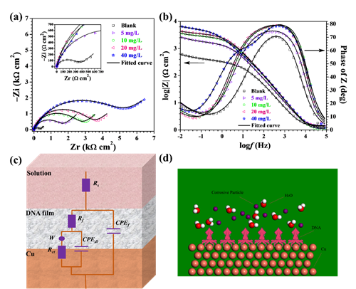 图1 (a)铜电极在含有不同浓度的DNA的盐酸溶液中的Nyquist图,(b)Bode图,(c)等效电路,(d)吸附机理
