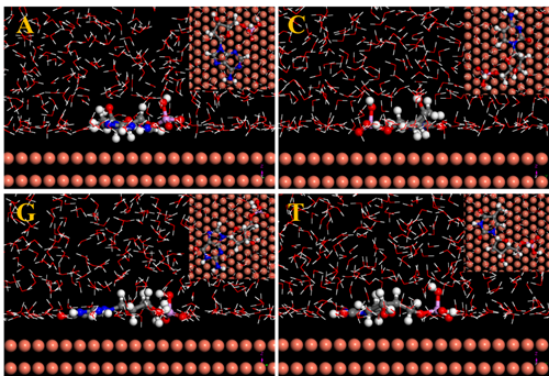 图3 DNA分子单组分在Cu(111)表面上吸附的平衡构型:腺嘌呤核苷酸(A),胞嘧啶核苷酸(C),鸟嘌呤核苷酸(G)和胸腺嘧啶核苷酸(T)