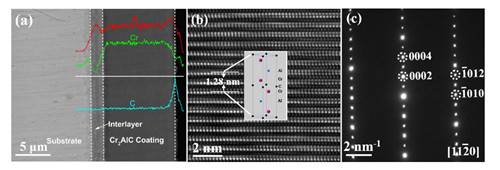 图1 (a) 电弧复合磁控溅射技术制备的Cr2AlC MAX相涂层截面形貌图,(b-c)TEM与电子衍射图