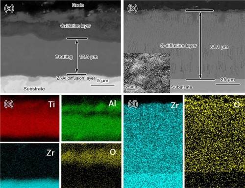 图2 经1200℃氧化5min后截面形貌;(a)/(c)Ti2AlC涂层及EDS图,(b)/(d)锆合金基体/EDS图