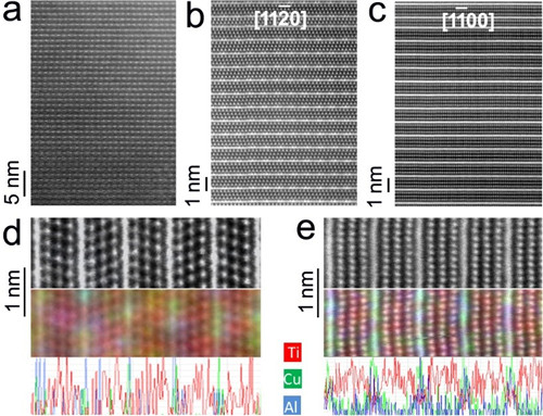 图1 扫描透射电子显微技术结构和成分分析揭示出高原子序数Cu原子进入Ti3AlC2相Al原子层中并体现出一定的结构有序性