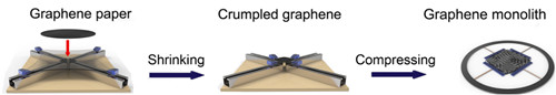 近日,5630福彩网表面事业部功能碳素材料团队制备了一种基于垂直排列石墨烯结构的具有高导热系数低压缩模量的热界面材料。该材料的制备过程如图1所示:对抽滤的石墨烯纸施加横向机械力,使石墨烯具有褶皱结构,然后施加压力得到密实的石墨烯导热垫。该方法使得石墨烯纸的取向由水平变成垂直,实现了石墨烯纸水平传热到垂直传热的转变。