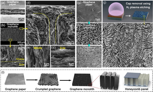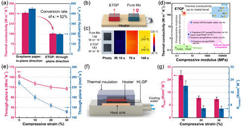 图2(a–k)为石墨烯导热垫在制备过程中各阶段的形貌变化,最终的石墨烯导热垫在微观上呈现多层结构,中间以垂直排列的石墨烯为主,顶部和底部有一薄层水平排列的石墨烯,整体结构与蜂巢板类似(如图2(l))。实验所用的作为原料的石墨烯纸的面内热导率为273Wm-1K-1,经过结构转制之后所得到的的石墨烯导热垫的纵向热导率为143Wm-1K-1(转化率达52%),已经超过了大多数的金属(如Mo、Zn、In、Ni、Fe等),相应的结果见图3(a–d)。除了拥有高的导热系数,该石墨烯导热垫还具有与硅胶相当的压缩模量,仅有0.87MPa,远低于金属材料(图3d),有利于在封装时产生变形,实现较低的接触热阻。在30%压缩率下,石墨烯导热垫的面外热导率仍超过了100Wm-1K-1,接触热阻低至5.8Kmm2 W-1,如图3(e–g)所示。