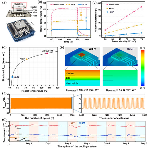 在实际的热界面性能评测实验中,以石墨烯导热垫作为热界面材料的系统热源温降达到65℃,远高于应用商用热界面材料所实现的温降(38℃),实验结果如图4(a–c)所示。图4(d–e)为CFD仿真软件对散热过程的模拟,结果显示石墨烯导热垫的接触热阻低于主流的商用导热垫。在图4f中,石墨烯导热垫表现出了良好的热循环稳定性,在经过2500次热冲击测试后散热性能性波动低于0.5%;除此之外,该石墨烯导热垫还具有长时稳定性,在20Wcm-2的功率下连续工作7天,加热片与环境温度的差值无明显变化(图4g),显示出良好的热冲击稳定性以及长程稳定性。目前相关工作已经发表在ACS Nano (2019, DOI: 10.1021/acsnano.9b05163)。该研究工作获得国家重点研发计划(2017YFB0406000)、中国科学院战略重点研究计划(XDA22000000)、中科院装备(YZ201640)、宁波市重大专项(2016S1002和2016B10038)以及宁波市国际合作(2017D10016)的资助。