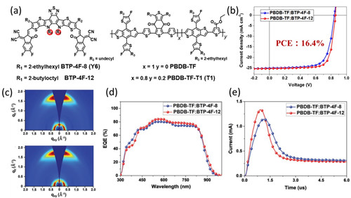 图1 (a)分子结构,(b)J-V曲线,(c)PBDBTF:BTP-4F-12体系的2D GIWAXS图,(d)EQE曲线,和(e)photo-CELIV测试结构