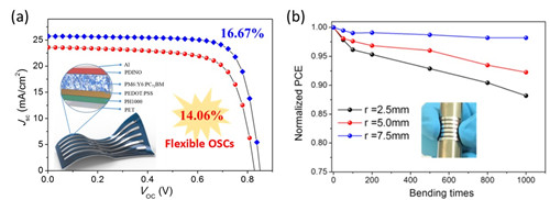 此外,课题组采用三元共混策略,即通过在宽带隙聚合物给体PM6和窄带隙受体Y6二元体系中引入第三组分PC71BM,进一步拓宽光活性层的吸收范围和优化薄膜的形貌,获得了单结刚性16.67%和柔性14.06%效率的OSC原型器件,这是目前公开报道的效率最高的柔性OSCs。电池经过1000次连续弯曲(弯曲半径r = 5.0 mm)后,仍能保持初始效率的90%,表现出非常好的耐弯折性能,这为制备高效的OSC柔性器件提供了重要的指导。该工作以“16.67% Rigid and 14.06% Flexible Organic Solar Cells Enabled by Ternary Heterojunction Strategy”为题发表在Advanced Materials上(2019, 31, 1902210)。全文链接:https://onlinelibrary.wiley.com/doi/full/10.1002/adma.201902210。