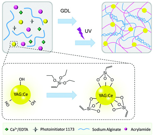 该工作以“White-Light-Emitting Flexible Display Devices Based On Double Network Hydrogels Crosslinked by YAG:Ce Phosphors”为题发表于Journal of Materials Chemistry C, DOI: 10.1039/c9tc05311e(全文链接:https://pubs.rsc.org/en/Content/ArticleLanding/2019/TC/C9TC05311E#!divAbstract)。该研究得到了国家自然科学基金(21574145、51803227、51873224)、浙江省自然科学基金(LY17E030011、LQ19E030010)和中科院PIFI国际访问学者项目(2019VBA0016)的支持。