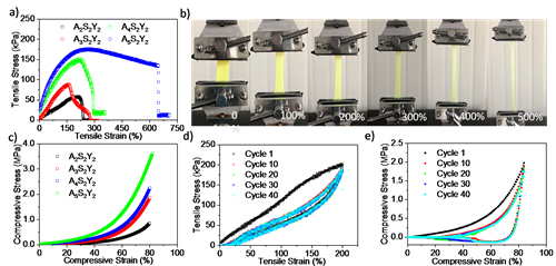 图2 具有不同丙烯酰胺含量的凝胶在(a)拉伸和(c)压缩下的应力-应变曲线;(b)凝胶在不同拉伸应变下的状态;凝胶在(d)循环拉伸和(e)循环压缩过程中的应力-应变曲线