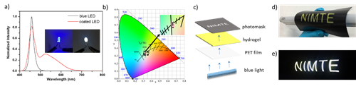 图3 (a)将凝胶涂覆于蓝光LED表面后的白光发射谱与照片;(b)所发射白光的CIE坐标值;(c)柔性白光发射显示装置在(d)自然光和(e)蓝色背光下的照片