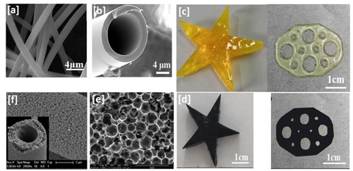 图1 基于先驱体转化制备SiC材料:(a)静电纺丝SiC纤维;(b)中空SiC纤维;(c)3D打印SiC先驱体;(d)3D打印SiC先驱体转化陶瓷;(e)多孔SiC泡沫;(f)多孔中空SiC纤维