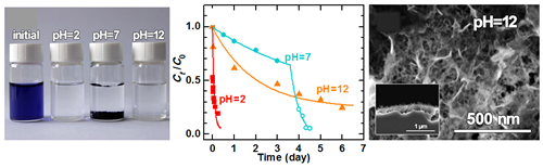 印染等有机污水是工业污水的重要源头,近年来国内外同行发现铁基、镁基、钴基等非晶合金在降解偶氮染料溶液方面具有优异的性能,其褪色速率可以达到相应晶态合金的几十甚至上千倍。研究团队前期通过球磨法引入残余应力提高铁基和镁基非晶合金粉表面能量状态,显著提高了其降解偶氮染料活性,降解偶氮染料速率分别达到商业铁粉的200倍和1000倍(Adv. Funct. Mater. 22, 2567 (2012). Sci. Rep. 2, 418 (2012).《中国材料进展》(Materials China)33(5), 270 (2014))。然而,一般情况下褪色速率随着溶液pH值的升高会迅速降低。考虑到实际染料污水很多都是碱性溶液,因此开发在碱性溶液中可以快速褪色的非晶合金体系对促进其应用有重要意义。为了解决这个问题,团队发现铝基非晶合金在较宽pH范围内都可以快速降解偶氮染料,而且在碱性(pH=12)和酸性(pH=2)溶液中比中性条件下降解速率快1.5和189倍。研究表面结构和元素成分表明,铝元素首先发生去合金化反应,表面形成富镍和富钇纳米多孔层,从而增强染料吸附的作用,加快染料褪色降解过程,如图1。这些结果表明铝基非晶合金在降解碱性、酸性和中性染料污水方面都有良好的应用前景,相关结果发表在J. Alloys Compounds 701,759(2017)。