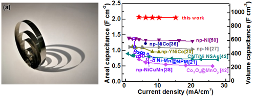 图2 Al基非晶合金柔韧性演示和不同纳米材料赝电容的倍率特性对比
