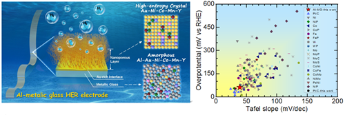 非晶合金作为非平衡材料,其最大特点就是可以在非常宽的成分范围内添加不同的合金元素,实现材料的多功能化。研究团队以Al基非晶合金为基体,少量添加贵金属元素控制材料成分,探索开发具有高性能活性的析氢催化剂,成功开发出Al80Ni6Co3Mn3Y5Au3非晶合金材料,发现其在酸性环境中析氢反应过电位约为70 mV @ 10 mA cm-2,Tafel斜率约为39 mV dec-1,可与商业贵金属Pt/C电极(33 mV @ 10 mA cm-2, 38 mV dec-1)相媲美。通过对微结构和反应机制的研究,团队发现这种高催化活性可以归因于表面形成的多组元高熵合金纳米多孔结构,其中均匀分散的多重元素的协同作用使其获得了非常高的氢转化频率和离子输运电导率,如图3。非晶态中独特的原子均匀扩散效应,使得界面形成富金保护层,从而表现出长时间稳定性。而且该材料还带有非常高的屈服强度、较大的弹性和良好的导电性,是一种理想的独立式催化电极,相关工作发表在J. Mater. Chem. A 8, 3246 (2020)。