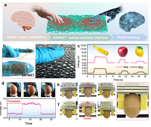 最近,该团队在J. Mater. Chem. A上报道了一种自保护、可重复使用、高灵敏度的织物传感器,题为”Self-Protective, Reproducible Textile Sensor with High Performance towards Human-Machine Interaction”(DOI: 10.1039/C9TA10744D)。在该工作中,研究人员针对织物基传感器容易受到外界机械化学环境干扰的问题,特别是人体表皮的汗液、油脂以及穿戴磨损对器件的长期稳定使用的阻碍,设计了一种超疏液、耐磨损、高灵敏度的电子织物(SPRET)。SPRET由三部分材料组成,包括织物基底,以及由通过化学键等强相互作用稳定在织物表面的碳管导电网络和多功能的聚合物涂层(图1)。其表现出了对多种日常试剂的排斥,在胶带磨损以及洗涤试验后其疏液、传感性能几乎保持不变(图2、3),并实现了在汗液/水环境下对人体运动的无损检测以及对机器人的精准控制(图4),以及在机器人学习上进行探索,使得坚硬的机器手在抓取脆性的物件如鸡蛋时既能完成抓取任务,又能保证鸡蛋不破碎(图5)。所设计的柔性传感器在长期、连续、可靠监测人类行为方面表现出了实际性的应用潜能。