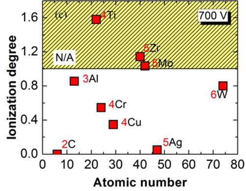 图1 HiPIMS不具有本征高离化率,相同条件下不同元素离化率差异显著