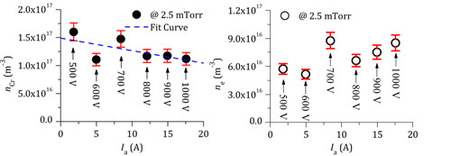 图3 以Cr为例,随脉冲偏压增加,原子密度降低但离子密度增加
