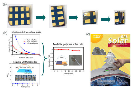 图1 可折叠太阳电池(a)折叠电池具有减小尺寸的功能展示,(b)可折叠有机电池构筑,(c)Solar RRL期刊内封面