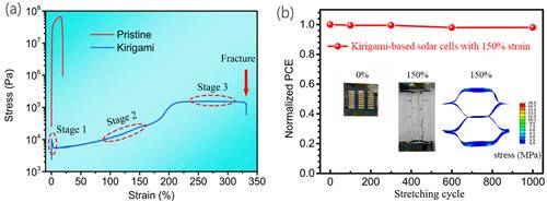另一方面,可拉伸太阳电池,能与复杂变形或运动物体表面结合,是新兴的柔性供电源。然而,常规太阳电池在增大拉伸应变量时受到的应力急剧增加,导致器件失效,给实现兼顾耐较大拉伸应变量和拉伸稳定性(如100%应变下拉伸1000次)的太阳电池带来挑战。团队受中国古代剪纸艺术启发,与苏州协鑫纳米科技有限公司和浙江大学合作,采用剪纸结构设计使得整个器件在大拉伸应变下受到的应力指数级降低(图2a),从而实现可耐200%拉伸应变,同时150%应变下稳定拉伸1000次的钙钛矿电池(图2b)。此外,基于剪纸结构的钙钛矿电池还具有扭曲(角度可达450°)、弯折(半径可低至0.5mm)等变形能力,而且具有1000次的扭曲、弯折稳定性。这类基于剪纸结构的钙钛矿电池具有变形能力强和制造工艺简单等优势,为设计其它可变形光电器件提供了方法。相关研究工作发表于ACS Nano 2020, 14, 1560-1568。