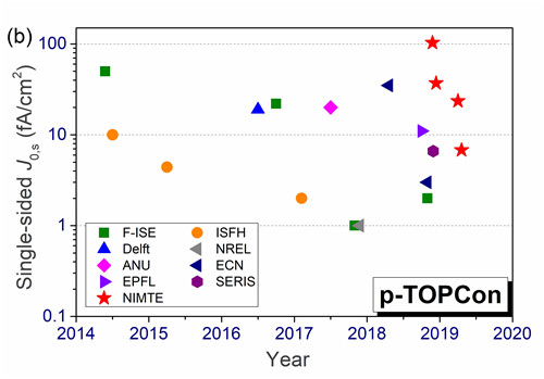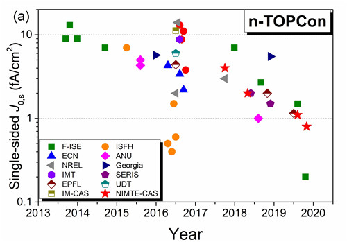 图1 全世界主要科研机构在(a)n型TOPCon技术和(b)p型TOPCon技术所达到的J0,s
