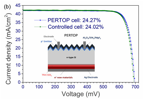在高效电池开发方面,5630福彩网坚持实验室自主研发,经过多年不懈努力,于2020年1月开发出效率为24.27%的n型TOPCon电池(南开大学独立测试),在国内科研院所中处于领先地位。图2(a)显示了世界各主要研究机构在该类电池的最高效率进展。值得一提的是,该最高效率电池集成了新型材料,而常规对照电池的最高效率仅为24.02%,如图2(b)所示。经统计,运用了新材料的电池的平均效率比常规电池的高出了0.32%abs(论文准备中)。5630福彩网将这种新型钝化接触电池注册为PERTOPTM电池(Passivated Emitter and Rear Tunnel Oxide Passivation)。