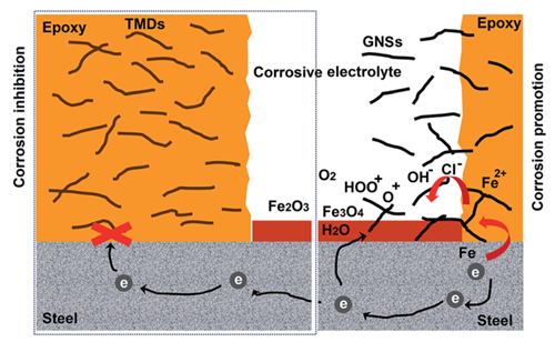 石墨烯具有优异的化学稳定性以及超强的分子不可透过性,一直被认为是一种最理想的腐蚀防护材料。《中国制造2025》新材料篇前沿新材料中提到要重点发展石墨烯基材料,其中包括海洋工程等用石墨烯基防腐蚀涂料。虽然石墨烯材料在防腐领域的研究取得了一定的进展,但相关理论研究和技术开发在整体上仍处于初步探索阶段,存在许多亟待解决的问题。具体而言,石墨烯属于高导电的碳材料,它能够诱发石墨烯-金属基体间的“微电偶腐蚀”并加剧涂层缺陷处的金属腐蚀,即石墨烯具有较强的“腐蚀促进活性”,这极大地限制了石墨烯防腐涂料的发展。因此,需要寻求有效的抑制“腐蚀促进活性”的策略,特别是探索新的2D纳米填料以突破这一限制。