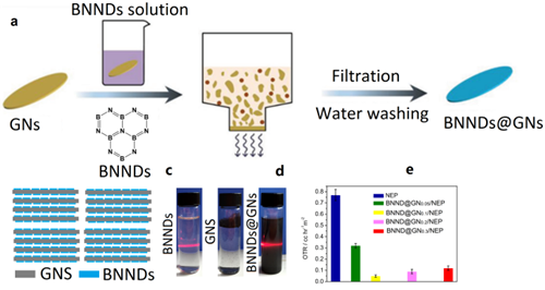 图2 (a)BNNDs在石墨烯表面的沉积过程,(b)BNNDs@GNs复合片,(c)BNNDs及石墨烯的分散行为,(d)改性石墨烯聚合物涂层的屏蔽性