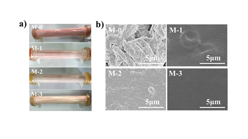 3)界面植入凝胶制备自抗凝透析器:为了实现改性过程无溶剂、绿色化,同时增强改性涂层与膜基体的结合力,防止改性涂层的脱落,研究团队将抗凝凝胶皮层通过界面植入的方式均匀地固定在中空纤维限域通道内,如图2所示。整个改性过程基于水体系,完全避免了透析器在清洗过程中的有机溶剂残留。基于对血液凝血级联反应的进一步理解,研究团队将海藻酸钠和丙烯酸合成了一种富含羧酸盐的改性聚合物,其抗凝机理不同于类肝素物质,对于膜材料表面的亲水性提高显著,并且能够螯合血液中的钙离子以阻断凝血瀑布。不仅能够提高透析膜的抗凝性能,对于抑制补体活性,防止免疫系统的激活同样具有十分优异的表现。偶氮二异丁腈(AIBN)为羧酸聚合物与基体材料的结合提供了连接点,通过控制AIBN的分布和植入量实现羧酸凝胶皮层的可控分布和厚度可控。该项工作已发表于Journal of Membrane Science, 2020, 604, 118082.。