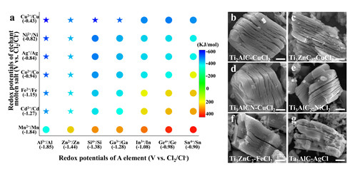 图2 左图为高温熔盐环境下阳离子与A元素的氧化还原电位/置换反应的吉布斯自由能映射图谱,颜色标尺代表对应反应体系吉布斯自由能大小,星号为本工作已经确认可行的反应体系。右图为根据映射图谱确定的剥离体系最终得到的MXene材料