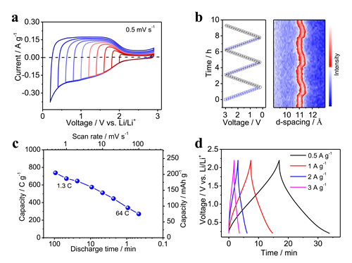 图3 Ti3C2Tx MXene在1M的LiPF6有机电解液中的电化学性能表征:(a)0.5 mV/s扫描速度下的循环伏安曲线;(b)恒定扫速下的原位XRD测试;(c)不同扫速下(放电时间)的放电容量;(d)不同电流密度下的恒流充放电曲线