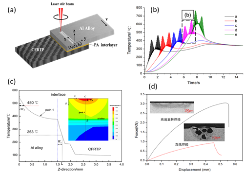 图1 铝合金-CFRTP激光旋转焊接技术:(a)铝合金-CFRTP激光旋转焊接模型;(b)铝合金-CFRTP结合界面温度变化;(c)深度方向温度变化;(d)高速旋转焊接与直线焊接对金属基体热损伤、焊接强度的影响对比