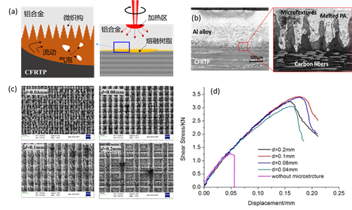 图2 铝合金-CFRTP微织构辅助激光焊接技术:(a)铝合金-CFRTP微织构辅助激光焊接原理;(b)铝合金-CFRTP界面机械嵌合结构;(c)不同短脉冲激光制备参数下的金属界面微织构形貌;(d)微织构辅助激光焊接强度对比